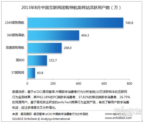 易觀智庫EDC近日發(fā)布2013年8月互聯(lián)網(wǎng)團(tuán)購導(dǎo)航類網(wǎng)站活躍用戶數(shù)報告,報告顯示,2345團(tuán)購導(dǎo)航以749.8萬的活躍用戶位列第一,而360、百度團(tuán)購導(dǎo)航則以404.3萬和268.0萬的活躍量位居二、三位,近期發(fā)展迅猛的團(tuán)800和57團(tuán)購網(wǎng)則分列第四和第五位。