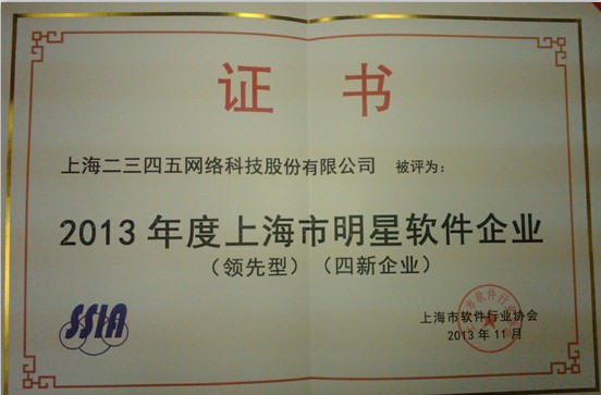 今年在嚴(yán)格的評審條件下,二三四五憑借豐碩的創(chuàng)新成果榮獲“上海市明星軟件企業(yè)(領(lǐng)先型)”、“2013年度上海市明星軟件企業(yè)(四新企業(yè))”兩項(xiàng)榮譽(yù)稱號,這是評定專家及廣大用戶對二三四五近年來在該領(lǐng)域取得卓越成績的肯定與激勵(lì)。同時(shí),此次殊榮的獲得,也為二三四五持續(xù)創(chuàng)新提供了更大的信心。