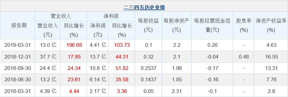 二三四五4月18日最新公布的2019年一季報顯示,其營業(yè)收入13.0億元,同比增長196.68%;歸屬于上市公司股東的凈利潤4.41億元,同比增長103.73%。基本每股收益0.1元。
