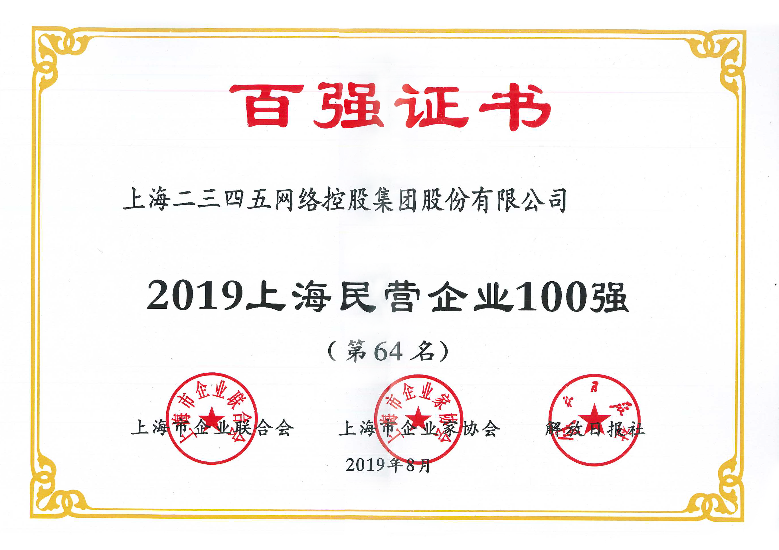 8月19日,上海市企業聯合會、上海市企業家協會、上海市經濟團體聯合會聯合發布2019上海百強企業榜單,上海二三四五網絡控股集團股份有限公司(簡稱“二三四五”,股票代碼002195)再次登榜,榮居上海民營企業百強排行64名,較上年上升5名。二三四五還同時蟬聯上海服務業企業100強和上海民營服務業企業100強。