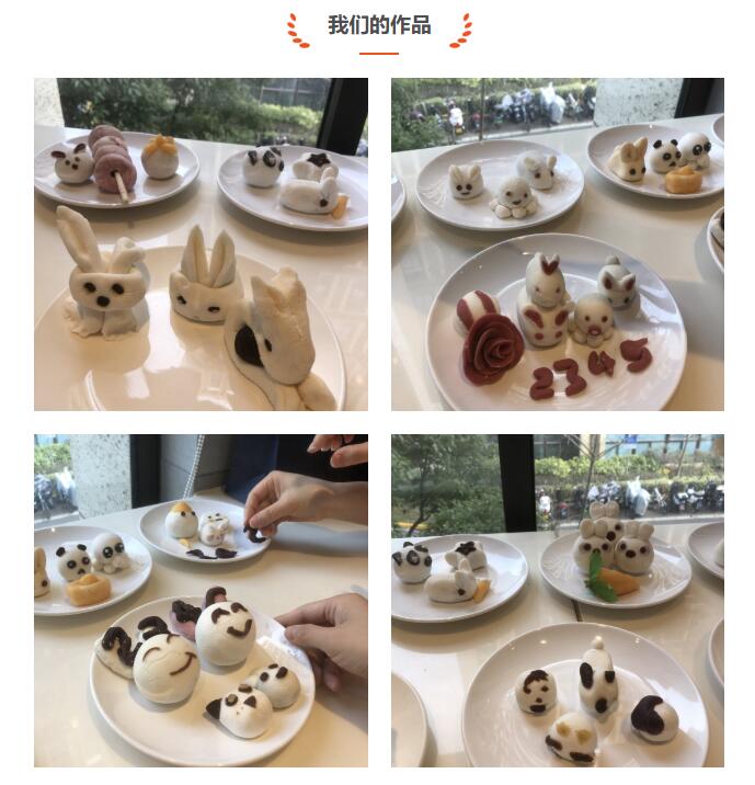 DIY現場的氣氛十分活躍,幾袋平常的面粉,加上餡料,在咱們2345小伙伴的手里,像變魔術一樣,包出了各種圖案的作品:小兔子、愛心、娃娃,當然還有我們幸運的小章魚。